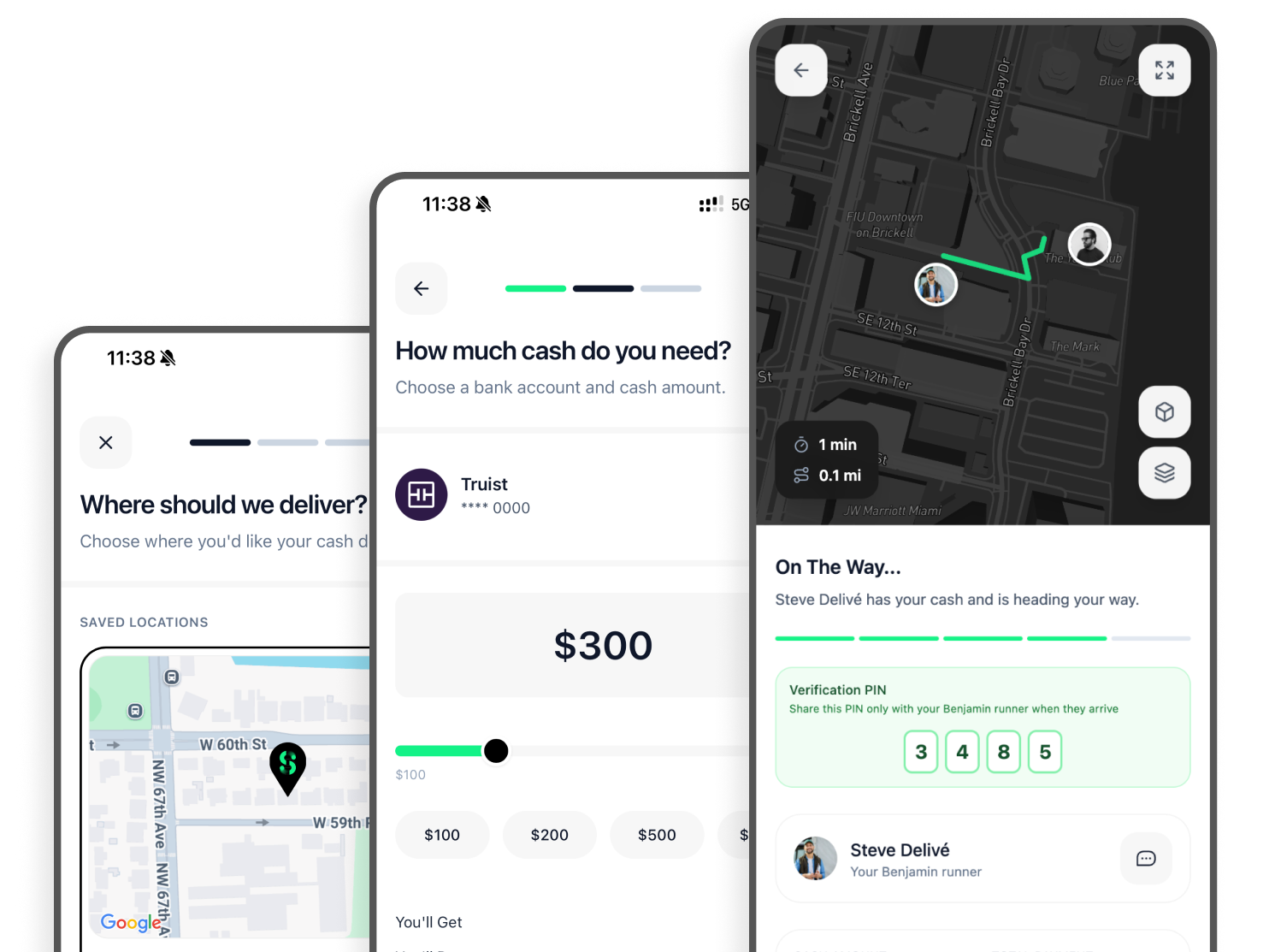 Our runners are background-checked, identity-verified, and trained to handle physical cash securely. Every delivery is GPS-tracked and insured from pickup to drop-off.