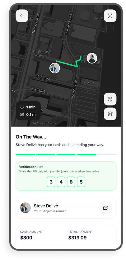 A vetted Benjamin runner delivers your cash in a tamper-proof sealed envelope. Every step is tracked in real time.